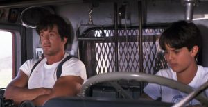 But all that dicking around: setting up child arm-wrestling matches, working out, letting the kid drive, and other white trash nonsense, the kid’s mom dies in the hospital before the kid can get there to say goodbye. You had one job, Sly, one fucking job. So, the boy doesn’t get to see his mother off, and he realizes his dad is an epic fuck-up, so he goes back to live with his grandfather. The movie should have ended there.