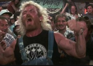 Sly goes to Vegas for the word series of arm wrestling or whatever it’s called. He pawns his truck and puts all of the money on a 20/1 underdog, himself! Also, the winner of the competition gets a brand-new truck, which is convenient. The opposite of that would be giving away a free tax break to whomever has the prettiest sailboat. While warming up, the announcer’s voice beams from overhead, “This is a double-elimination tournament! In other words, if you lose, you still have another chance!” Wow, I thought double elimination meant something else. Thanks for clearing that up.
