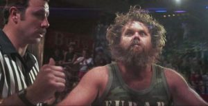 Sly then loses a match or a game or a contest or whatever it’s called to a bearded guy named Grizzly, but guess what, it’s a double elimination tournament!! They tell us again, just so everybody is clear on that. The kid gives Sly some pep talk and then Sly is ready to go out there and win. For the championship he has to arm wrestle Bull Hurley, who has never been defeated. He’s undefeated. Sly beats him and all the dramatic music is going on and they give him the trophy, but that’s bullshit because, according to my calculations, that is the first time Bull Hurley has lost, and this is a DOUBLE ELIMINATION TOURNAMENT, which means you have to stand up, punch yourself in the dick and run head first into the fucking TV. Nothing here makes sense.