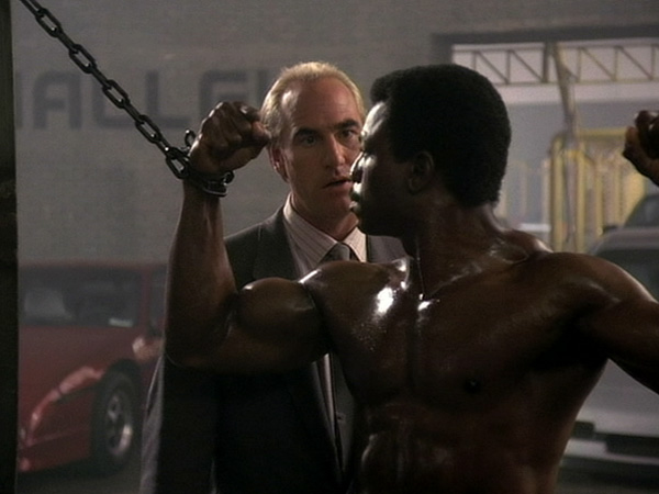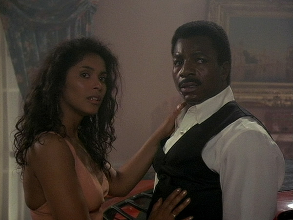 The story makes no sense. After explaining his evil plan to Jackson, Craig T. Nelson pursues it kind of inflexibly. The plan is that, after murdering Jackson, Nelson will have a guy dressed like Jackson kill a union boss during a big party at Nelson’s house, then frame Jackson and stage the drugie girl’s overdose. One crimp in the plan is that Jackson doesn’t have a particular way of dressing. Another is that the guy who will pose as Carl Weather’s character is a big fat pig with a shaved head. I mean, obviously all black people look alike. But you can still tell a fat bald one from a swole one with a full head of hair.