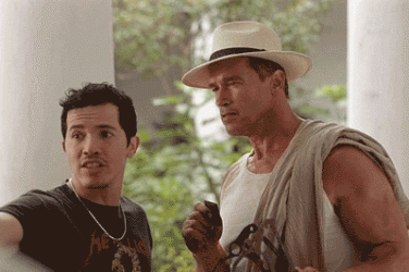 To begin with, this is superficially just another ridiculous action movie, like Commando or Predator, two movies that I enjoy as much as the next guy. So you have scenes like one in which Arnold looks at his nemesis through a window, perhaps thirty feet away. Arnold reaches behind his ear and pulls out a hand grenade. He attaches the grenade to a gas tank with a rubber band and fashions a timer out of a toothpick and the audience’s credulity as I shout “pull the pin and just fucking throw the fucking grenade! He’s thirty feet away!”