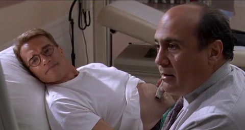Arnold goes into labor. Shit just got real. DeVito and the love interest arrive at the resort just in time to drive Arnold to a clinic where they will perform an emergency c-section. Predictably, DeVito’s ex-wife also goes into labor at the clinic, leading to much hilarious role reversal as Arnold’s love interest is told to wait outside of the operating room. She attempts to console and comfort DeVito’s ex-wife despite having no prior experience in pregnancy or childbirth. In the midst of all of this, Frank Langella’s evil department head is made to look like a fool and loses his job at the university. I realize that at no point in this film does Arnold’s love interest seem to do any real work at the university. I guess that’s what her grad students are for.