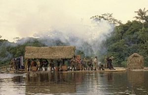 Ursua, is not pleased. Soon, the river washes away the other two rafts and Ursua decides that they will walk back to Pizarro–the mission is over. Not so fast, as Aguirre stages a mutiny, shoots Ursua and appoints Guzman Emperor. Technically, he is still only second in command, though Guzman is the definitive example of a puppet king. Fat, useless, arbitrary and cruel, he relishes his new position even though he has no real power to speak of. Pomp and circumstance only, a truly naked emperor, and in the middle of nowhere! Aguirre commands that a new larger raft be built and once again, they set off down the river in search of their fortune.