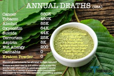 Suicide You have been living with pain for years, whether it be war wounds from Desert Storm or crushed vertebrae from a serious auto wreck. Your VA or Family Physician has suddenly cut you off from your much needed pain medication. Your doctor is terrified at the prospect of losing his medical license or being led away from his clinic in handcuffs. He takes the path of least resistance, and who can blame him? Looming legislation, hysteria over the Opioid Crisis and fear have left you with limited options. If you have access to Kratom, you are fortunate. If not, you can live a miserable existence with your pain, turn to dangerous street drugs like heroin (that may be laced with lethal doses of fentanyl), or you can just end your life.