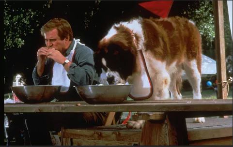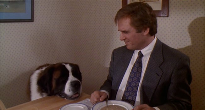 In the following scene, George attempts to express his financial worries to his uncaring family at the breakfast table, only to be interrupted by a far more pressing concern: “Beethoven wants you to scratch his head, Daddy.” While George’s pathetic ingrate of a son hits him up for money for karate lessons, Beethoven sneaks a piece of bacon from George’s plate and, when George gets angry about it, his awful children yell at him as if he is the bad guy. The beast is literally stealing food from his plate, and he’s just supposed to grin and bear it.