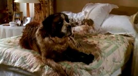 George even manages to come to a sort of understanding with the foul beast, who is now fenced in at night in the backyard… or so he thinks. Of course, Beethoven only sneaks out of his rightful imprisonment like the vicious cur that he is. In this particular case of Beethoven wantonly flouting the ancient roles of dog and man, he cuddles up in bed with George, who, exhausted from the constant demands of family and dog, believes it is Alice nuzzling him from behind. George begins to be physically aroused, ramping up the surreal nightmare that his life has now become. The dog practically rapes him in his own bed!