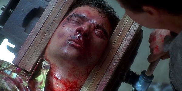 And so the bloodied and bruised Dogs, who already has one eye swollen shut from the relentless abuse, is laid on a workbench on his back with his head nestling in the device’s wooden jaws.