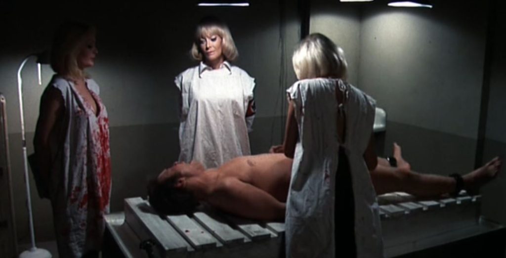 In Ilsa, She Wolf of the SS our horny heroine runs Medical Camp 9. This basically means she’s got carte blanche to torture prisoners to death. She takes her work seriously, though, and is keen to impress a visiting general with the progress she’s made. For a start she’s come up with an antidote for gangrene and a way to spread typhoid among enemy troops.