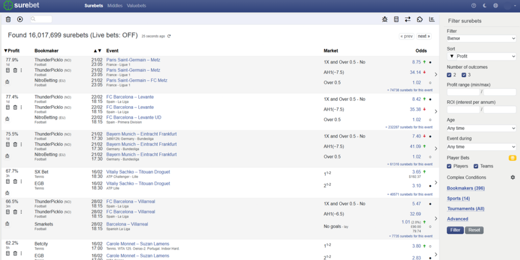 SureBet focuses exclusively on pre-match arbitrage, where it demonstrates high scanning speed. From a user perspective, no meaningful speed differences were observed when compared to BetBurger’s pre-match performance – both services deliver updates quickly enough to capitalize on opportunities before they close.