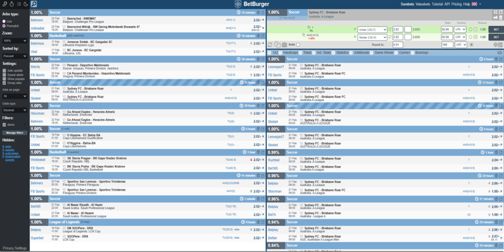 BetBurger is designed for more professional players who prefer live arbitrage. It’s the go-to choice for experienced bettors who need live in-play arbitrage and built-in analytics, and are willing to pay a premium for those features. However, it’s crucial to understand: working with Live requires extensive experience and maximum concentration. Any mistake can lead to financial losses, and no service will compensate for your losses. The fast-paced nature of live arbs demands instant decisions and carries elevated risks.