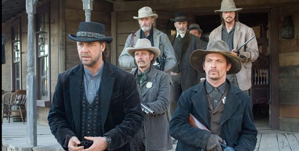 Mangold’s Magic: What do 3:10 to Yuma, Logan, and Ford v. Ferrari all have in common? They all have well acted father-child dynamics at the heart of their stories. In 3:10, it’s Dan’s son William (Logan Lerman) who is the core part of the battle of wits, wills and charisma between the black hat Wade and his father. At the beginning of the film, Dan seems like a loser- a rancher who’s about to have his land foreclosed on, an amputeed veteran who’s reduced to verge of begging. And Russell Crowe is a tempting figure. He may not have the confidence of Glenn Ford’s 1957 performance, but he instead carries a mixture of menace and intellect. He’s a criminal mastermind reluctantly abiding the pettiness and brutality of his accomplices.