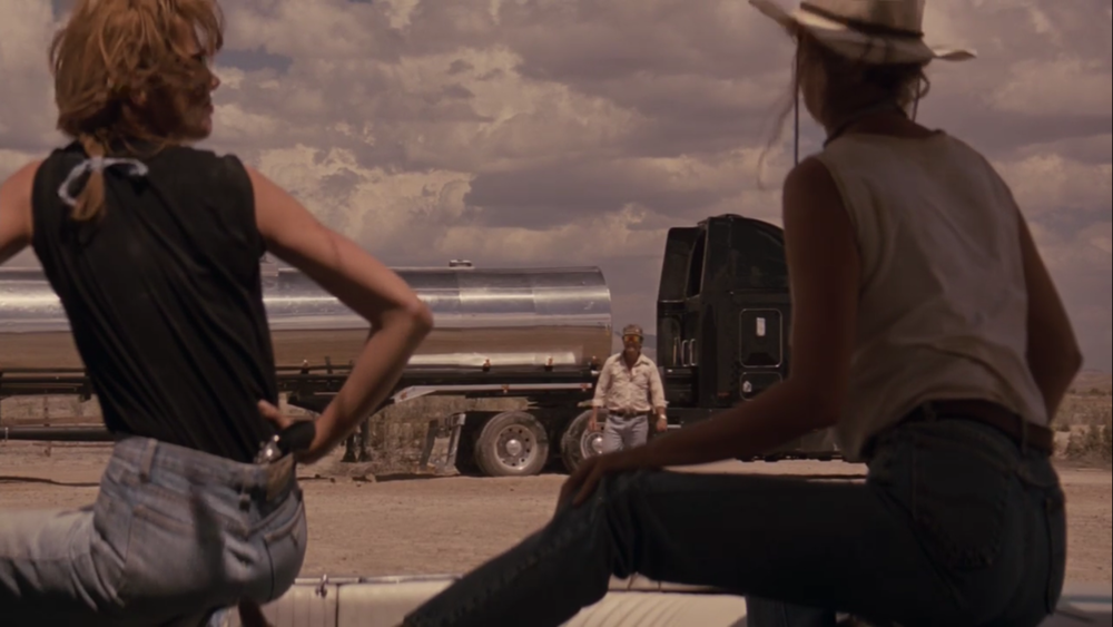 But Marco’s civility is what is known as lulling someone into a false sense of security. The first clue he’s not the most progressive chap is his mud flaps being adorned with the mirrored silhouettes of a busty, reclining woman. As Thelma and Louise pull up alongside, Marco’s still on his best behavior, grinning down from his cab and waving.
