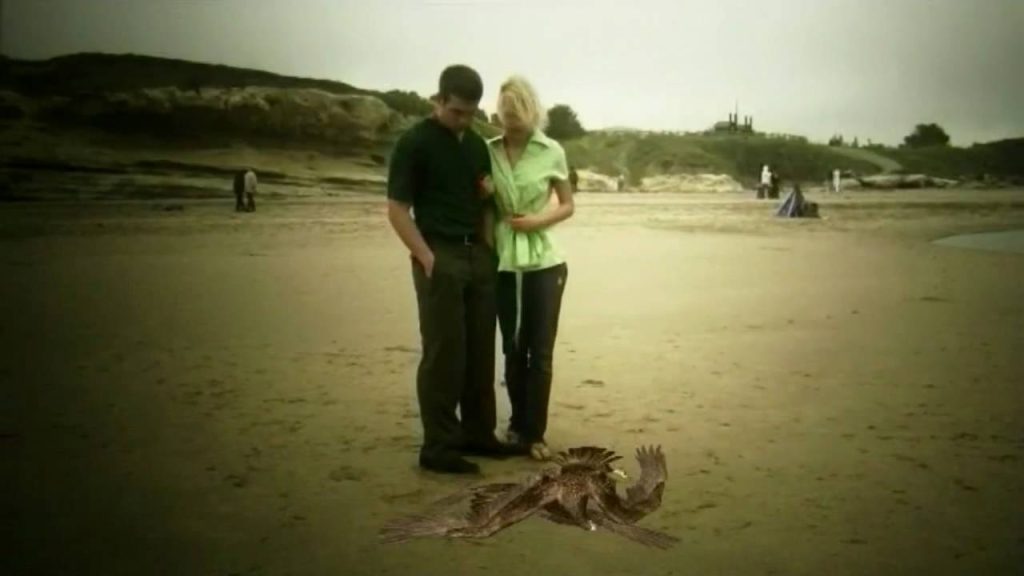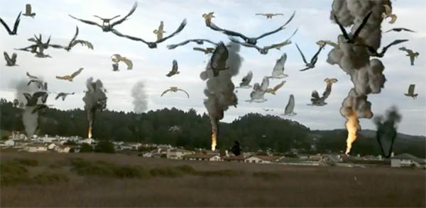 The birds, which are all eagles (apparently missing the intentions behind its inspiration, as Hitchcock willfully avoided birds of prey in his film, preferring to find horror in unexpected places), look like computer screen-savers superimposed over the live action, which is basically what they are. When they attack, our heroes manage to fend them off with coat hangers, though the birds are later seen easily dispatching men with guns. Apparently, they only kill when it’s convenient for the plot, such as it is.