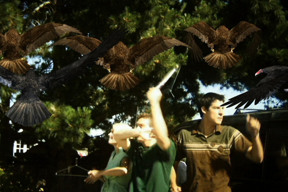According to a random tree-hugger (Stephen Gustavson) our heroes meet toward the end, the eagles are attacking people who are filling up their gas tanks, thereby contributing to the global warming that is threatening their natural habitat. The funniest part of this scene is that, immediately after imparting this information, the tree-hugger urges our heroes to run to their car and make their getaway while the birds are distracted. I guess the birds can tell the difference between hybrid cars and gas-guzzlers. They also apparently have the cognitive capacity to choose not to harm Rod and his environmentally friendly friends despite the fact that these very same clowns have been shooting the birds down throughout most of the previous scenes (after abandoning the less effective coat hangers).