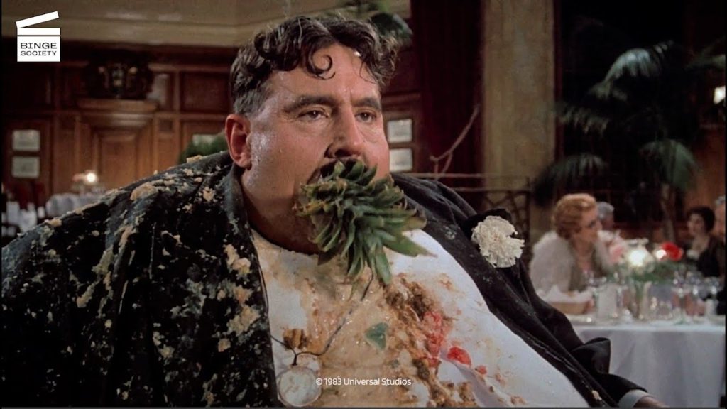 Played by Terry Jones, Mr Creosote enters a high-class restaurant very much dressed for the occasion. However, that’s his only nod toward civilized behavior because it doesn’t take long for him to tell the French waiter (Cleese) that he needs a bucket to throw up in. He proceeds to puke left, right and centre, including onto the back of a cleaning lady. He eventually orders the entire menu, as well as six crates of brown ale. His repugnant antics cause some fellow diners to leave, but Cleese remains relentlessly polite. After the meal is completed, Mr Creosote is offered a mint chocolate on a silver platter.