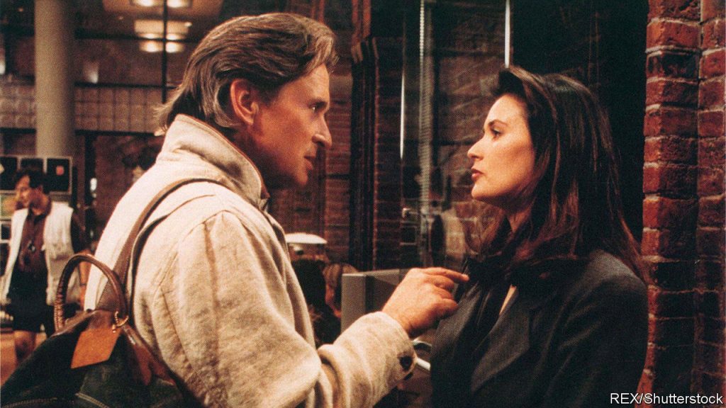 And fair play to Demi Moore, she nails her role as a ruthless, power-hungry corporate cow. Now I don’t usually care for her (bloody hell, have you seen Striptease and G.I. Jane?), but she has her uses (A Few Good Men) and she’s superb here. Every scene with Douglas is a corker. Meredith’s a shell of a person, some sort of frightening prototype, a cold, humorless bitch, and ambitious for ambition’s sake. I suspect if you scraped off her perfectly applied makeup you’d find cancerous sores. In the classic 70s movie Network Max Schumacher (William Holden) rips Diana Christensen (Faye Dunaway) apart by ramming home the ‘shrieking nothingness’ of her existence. Well, Meredith’s the personification of shrieking nothingness, a status-obsessed woman who must win at all costs. There’s no love in her, no warmth, no joy. Her only claim for sympathy is that these days women know they’re supposed to be assertive both in the workplace and in bed, a seismic shift that rejects motherhood and perhaps forces some of them to ape the aggression of men.