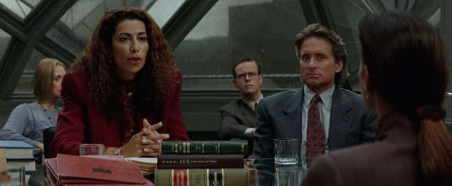 Wow. What a bloody great scene. Bold, graphic and a long way from black and white, but it’s still clear the entitled Meredith has abused her power as his new chief. On top of that I’ve got so used to seeing Michael Douglas bossing others that it’s a real eye opener to catch him in a passive role, eventually fleeing from a woman with his tail between his legs. Indeed, he spends most of the movie in a state of extreme discomfort as the poison of her ensuing sexual harassment claim spreads.