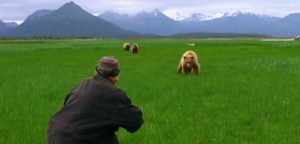 So? What kind of a person would devote his life — for no pay — to living with grizzly bears? Not who you would think. Growing up in Long Island, Treadwell was a failed collegiate diver who turned failed Hollywood actor turned successful drunk. As he explains to the camera, he made a deal with the grizzlies that if he will protect them from humans, they must save him from the drink. He knew nothing of the reality in which he traveled so often. Nothing of the bears biology, of the harshness of the environment, the customs and beliefs of the locals — nothing. He simply loved the giant things. Too much. And yes, after watching nearly two hours of “his” bears going about their business and almost hanging out with Treadwell, a seductive anthropomorphism manifested itself to me. Golly gee willikers, those big fluffy bears are awfully cute!