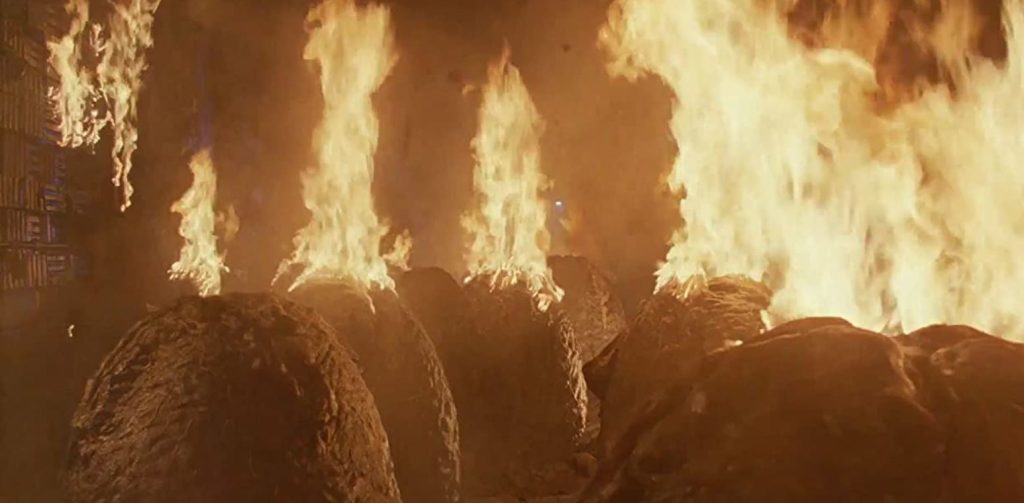 Cameron, who wrote the screenplay, builds on rather than repeats Alien. This can be seen in the way he adds nice little details to the creatures’ lifestyle, such as the face huggers’ increased mobility and the alien queen laying eggs near a cocoon of imminent hosts. He also excels at creating a sense of scale, whether it’s a beautiful shot of the curves of Ripley’s face fading into that of a distant exomoon or panicking humans fleeing from the path of a crashing spacecraft.