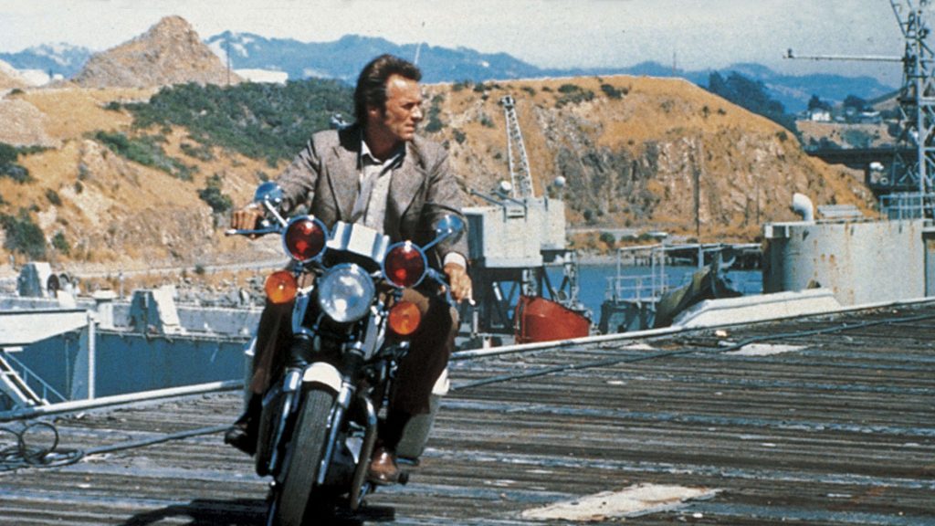 Written by right-winger John Milius and the upcoming Michael Cimino, Magnum Force never shies away from its gun fetish or rabid law and order stance. That doesn’t mean it’s not a terrific watch. It boasts hard-bitten dialogue, a cool score and smart bursts of action, such as a swimming pool slaughter, a naked, drugged-up chick plunging off a balcony, a head-on car-motorbike collision and a bloody terrific finale on an abandoned aircraft carrier. Harry remains a slick operator and effortlessly charismatic, a chick magnet in one scene while needling his tight-arse boss the next.