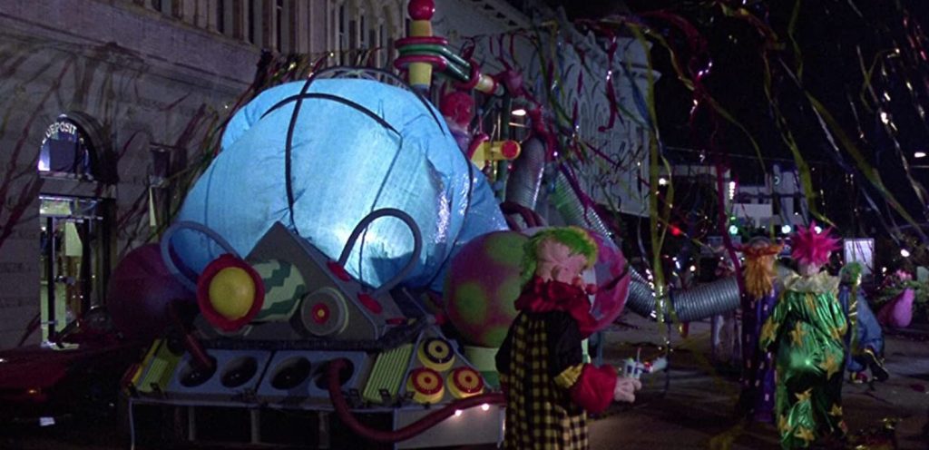 The influence of earlier horror flicks is immediately apparent as we see the mischievous teens vs. the unbelieving and annoyed police, like in the ground-breaking movie, The Blob. We also notice the Klown’s not so subtle cocooning of humans in pods, made of cotton candy. I mean, these Kreepy Kolorful Klowns are actually having a parade down main street, tossing their victims out of 2nd floor windows, to their hench-klowns below. Great stuff!