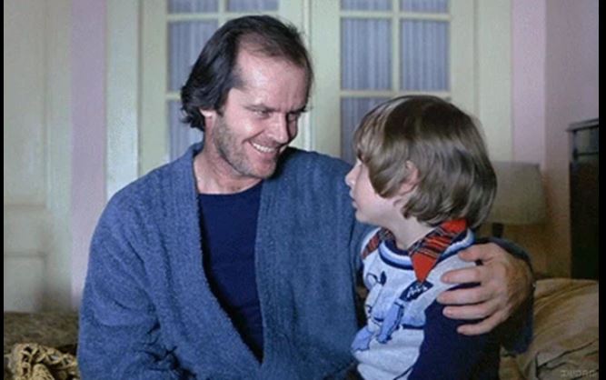 It is a Monday, we are told by the intertitle, and tensions have been mounting between Jack (Jack Nicholson) and Wendy Torrance (Shelley Duvall). Jack is supposedly napping upstairs, so Danny is careful not to make noise as he enters the upstairs room, a common and relatable childhood fear accentuated by the eerie, ominous score, then the unsettling quick pan over to Jack sitting silently, staring blankly but fully awake, presumably listening to the ghosts of the Overlook Hotel as they speak inside his head.