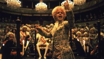 His would-be murderer, the peanut-butter-and-jealous Court Composer: Salieri, a real man who really, really hated Mozart and used all manner of court intrigues and rumor campaigns to harry and undo his rival, sits across from the dying genius to help him capture his final opus, a Requiem Mass, one the movie slyly states was commissioned by a ruthless Salieri on an overworked and grief-feeble Mozart in order to push him into the great abyss.