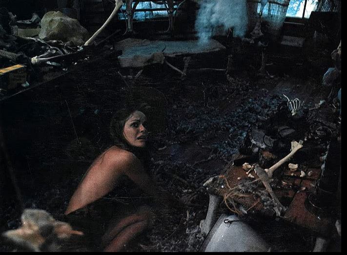 The next shot is a cut to Kirk’s POV at the main entrance, looking in at the stairs going up to the second floor of the house, the animal pelts hanging on the wall at the end of the hallway, and the thing that draws our eye the most, the room to the right of those pelts, its red-painted wall hung with various animal skulls, bones, and mounted heads. “Hello?” Kirk ventures again, his tone betraying a rising dread.