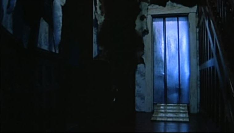 “Hey, Pam…,” Kirk says as we reverse back to the tight medium shot of him, barely looking back to his unseen companion and the outside world into which his mounting, dreadful fascination prevents him from retreating. The squealing continues, though, and Kirk enters the house, letting the screen door (and any last chance of escape and survival) close behind him. “Hello?” he shouts once more, before all too eagerly jogging forward to his doom.