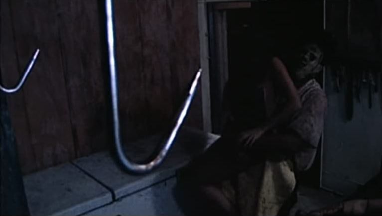 Back to the doorway POV for the first amazingly realistic strike, a viciously accurate blow to the young man’s skull, and Kirk falls quickly, lying still almost long enough for a jubilant cry of victory from Leatherface that is nearly indistinguishable from his earlier swine calls. Then he begins a feverish, unconscious head-trauma seizure, his feet tapping wildly on the floor as his body jerks around in a grotesque parody of dance.