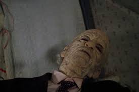Meanwhile, Leatherface is patting his frail shoulders and kissing the top of his head, the only time he shows any affection in the entire movie (excluding that for his trusty chainsaw). Perhaps some sustenance would enable Grandpa to take a livelier part in proceedings. Leatherface cuts the girl’s finger and sticks the bleeding digit into the senior citizen’s mouth, causing her eyes to widen as he starts enthusiastically sucking. Suddenly both arms are off his lap and swaying with excitement. There’s life in the old dog yet!