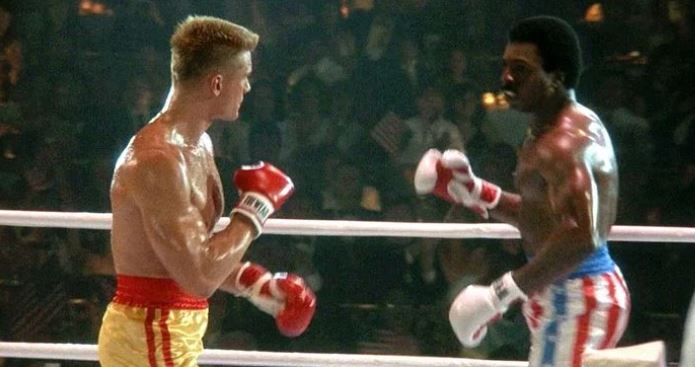 At the beginning of Rocky IV, Rocky and Apollo dance around the ring throwing mock insults but essentially admiring each other’s physiques. It’s one of moviedom’s gayest starts, especially with lines like “I’m gonna whip your butt” and “You really look good for an older guy.” To be honest, it’s a bit of a surprise they don’t just embrace, lock lips and fall in soft focus to the canvas.