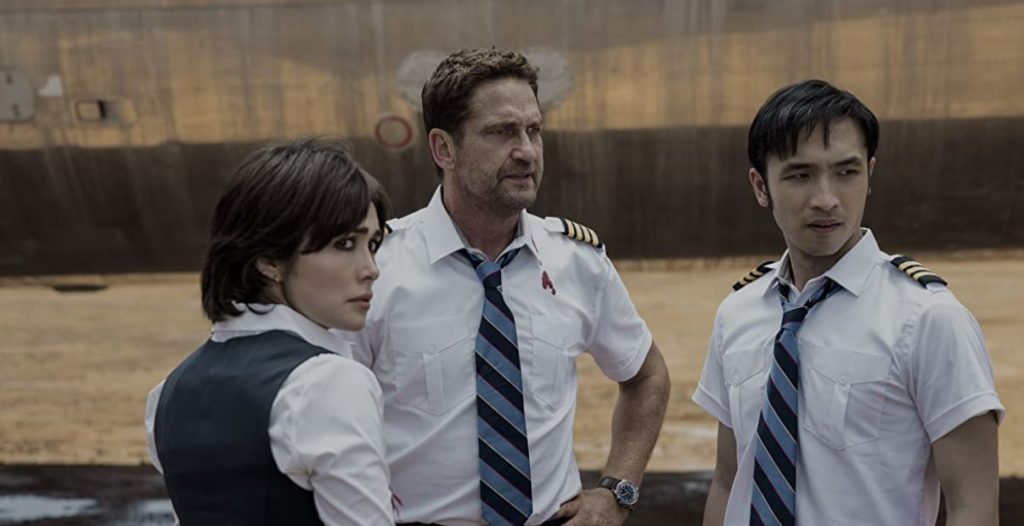 Commercial pilot Brodie Torrance (Butler) is in the middle of flying a sparsely populated plane from Singapore to Japan when lightning strikes the plane, knocking out all power. Torrance and co-pilot Samuel Dele (Yoson An) have just ten minutes of backup battery power to bring the plane down and attempt a crash landing (sea or land). This event covers the first thirty minutes of the film and it’s done well enough to make the audience grip their armrests and assume crash positions.