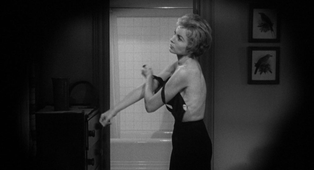 The first scene is pure Hitchcock intrigue as established by his moniker as the Master of Suspense: what was once a bland mid-day pan across Phoenix’ skyline switches to sudden curiosity through a focus on an open high-rise window faraway in the distance. The drawn curtains conceal a darkened room (a sleazy hotel) and the secret lovers’ illicit embrace writhing just behind its pane. That exchange is a complicated tryst’s pillow talk, and it sizzles and pops as such films are advertised as on our Classics page. Playful banter turns serious with the abrupt ultimatum issued by the more aggrieved party here (obviously, the woman). It is the bargaining moment for the duo’s affair, cut short again as one side (the man in post-coital lethargy of mind) must make a flight home.