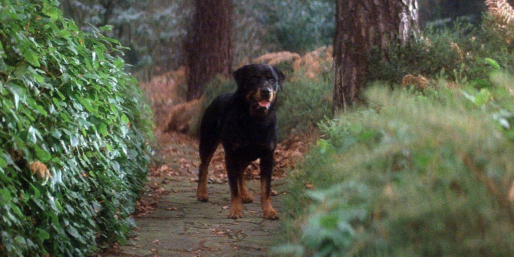 In many scenes he’s just a normal, tousle-haired little boy blowing out birthday candles, riding a merry-go-round, looking cute in a bobble hat or offering daddy a piece of cake. He’s even upset by the nanny’s public suicide, burying his face into his mother’s shoulder. That is, until the moment a Rottweiler shows up and he gives it a secretive little wave.