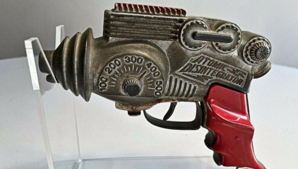 Derek, the humanitarian in the bunch, ran off to town to find the owner of the poor mutt that they had dispatched with their “Atomic Disintegrator”, which was in fact a plastic toy gun that had been purchased at Woolworth’s. This gun immediately turned anyone unfortunate enough to be a target, into an instant, very clean, plastic skeleton. This movie was made on a budget of less than $14,000, so they used the same cheap skeleton for each death shot, even the dog.