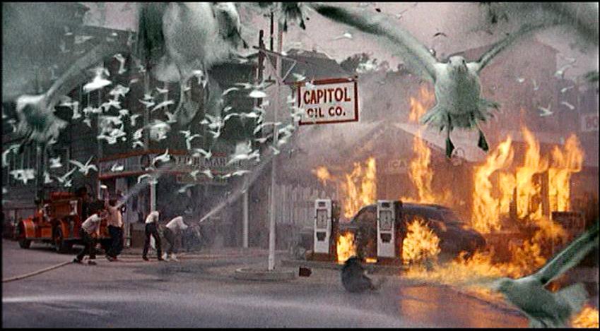 Later, in the diner sequence (it looks like a diner, anyway, though it also has a fully stocked bar) the elderly ornithologist, Mrs. Bundies (Ethel Griffies), and the Drunken Doomsayer (Karl Swenson) represent opposing ideological factions. Mrs. Bundy believes birds “bring beauty into the world” and would never harm people. The Doomsayer, true to his name, thinks it’s the end of the world coming, a divine retribution from an angry God. Once again, we see the split between the New and Old Testament ways of thinking. The Traveling Salesman (Joe Mantell) represents a third faction, the desire of Man to have control over Nature. “Kill them all,” he says of the birds. “Messy animals!” It is he who ultimately blows himself up with a carelessly tossed match in a puddle of gasoline, a victim of his own hubris. Before they attack, the gulls flying overhead seem almost to be laughing at the destruction below.