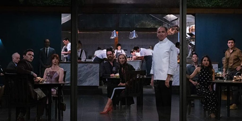 Far more charming is the head chef, Julian Slowik (Ralph Fiennes), though it is the icy, sadistically intelligent charm of a Hannibal Lecter. The two do indeed share both a refined palate and a strong distaste for the vulgar rich who can afford fine food but cannot appreciate it. I don’t mean to suggest by comparison that cannibalism is on this particular menu, though it would certainly be a shame to divulge too much one way or the other about just where the narrative goes.