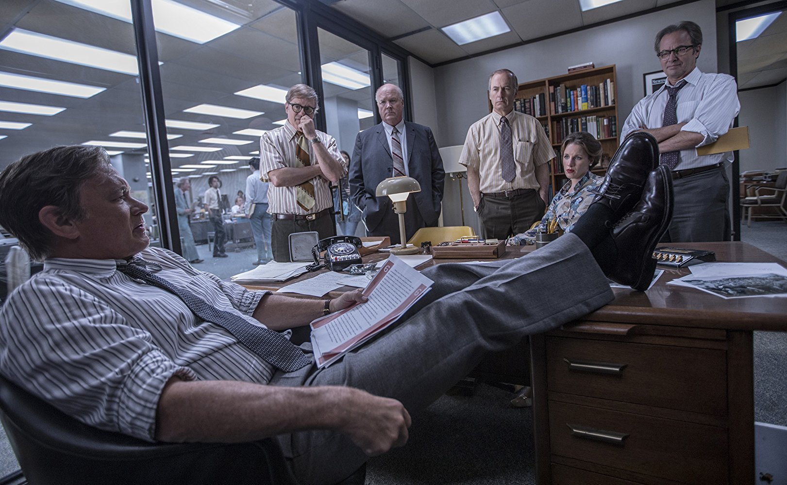 The tension builds as Bradlee suspects the Times is about to publish something huge, eventually proven correct. Bradlee is desperate to get his hands on a copy of the report and the second act of the film covers their search while trying not to cry over the New York Times spanking them every day. Luckily for them, Nixon and his appointees were various levels of horrible and the Justice Department filed injunctions to stop the Times from publishing any more of the report, citing national security and classified documents, etc. At this point, arguably the best scene of the film occurs, featuring Ben Bakdikian (Bob Odenkirk). Bakdikian meets with Ellsberg and the look on his face as he is hit with the reality of the situation is gold. But that’s nothing compared to the flight home (which I won’t spoil for you). Up to this point, the entire movie has been meticulously building to an all-night session at Bradlee’s house where Bradlee and a bunch of reporters pour through documents to find pieces to publish before the printing deadline. The tension climaxes as a bunch of suits try to pressure Graham not to approve publishing in light of the lawsuit against the Times.