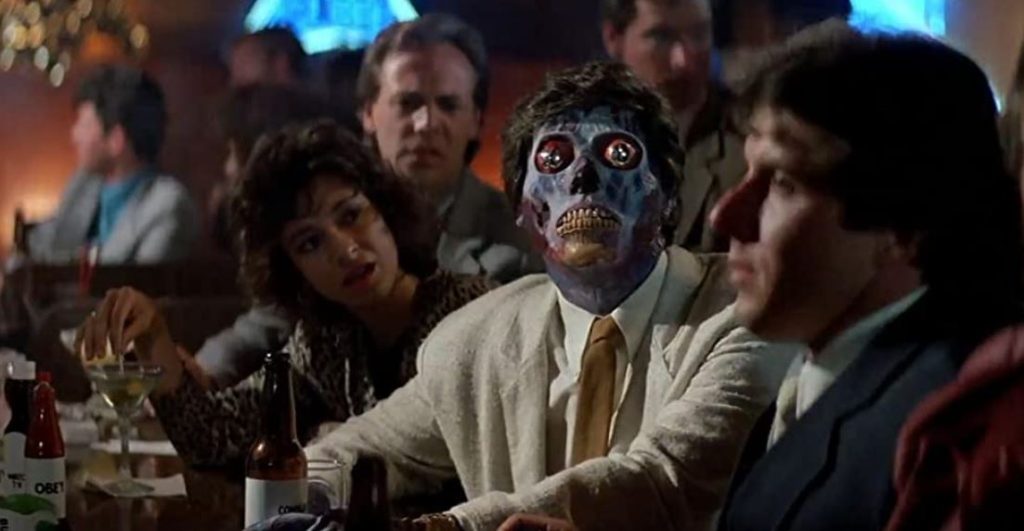 They Live’s opening doesn’t do too much wrong, especially its pivotal scene forty minutes in where our longhaired hero (calm down, Colonel) discovers a fancy pair of sunglasses that enables him to see subliminal messages everywhere (e.g., don’t question authority and stay asleep), as well as the aliens’ skull-like, otherwise hidden faces.
