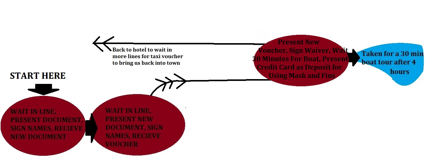 We finally made it out of there and were given a document and instructed to wait in line to sit at a table and sign our names. I’m not going to waste your time describing the labyrinth of resort-dwelling bureaucracy we got caught up in. That would be cruel. Instead, I drew you a diagram.