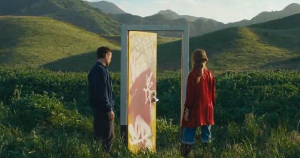 Sitting in a booth and eating his food, he spots Sarah two booths away. Weird. Sarah joins David, they chat for a while, then they walk to their respective, identical 1994 Saturns. More weird. When Sarah’s car won’t start, GPS tells David to offer Sarah a ride. He does. This is not weird, just polite. After some time and distance have passed, they reach a new destination. They walk into the woods and find a bright red door standing alone. With caution, they approach the door and David decides to walk through. At this moment, we are seeing the door from the side and we do not see David pass through the frame. Sarah joins him and the two find themselves in a lighthouse David once visited. Excellent and so very weird.