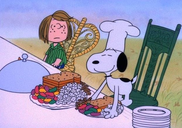 You see, Peppermint, without any prompting at all, invites herself and other friends to Charlie’s house for Thanksgiving dinner. The problem is that Charlie will not be at home, having accepted an invitation to Grandma’s house later in the day. Linus, with his philosophical blanket, suggests that Charlie, who has the communication skills of a pet rock, just have an early Thanksgiving for the annoying Peppermint, and attend Grandma’s dinner later. Charlie and Snoopy are in charge of the food prep, so you can guess what happens. Charlie knows how to cook only toast, pretzels, popcorn and Froot Loops and his guests are disgusted with him.