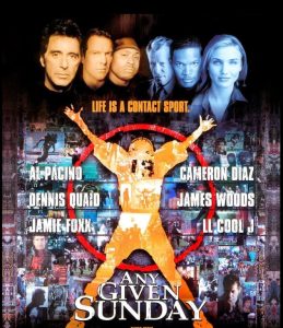 You can’t accurately describe Oliver Stone’s manic Any Given Sunday as a film; it is much better thought of as a two and a half hour long line of cocaine. Frenzied, harried, over-rendered and just a tad fucking nuts, this, uh, “film” really is the cinematic equivalent of getting cornered at a party by some dude who has been doing rails for most of the evening and now wants to talk your ear off–loudly–about a subject he is only marginally familiar with. It becomes shockingly clear that Stone and company are not only high out of their gourds, but are much more concerned with the politics of big time football than they are with the game itself. Some may argue that the two are intimately intertwined; two heads of the same coin. I argue that this is not a Michael Mann film and that the glorious game that is NFL football far overshadows any niggling concerns regarding the apparatus surrounding it. Stone chooses to think different. Compiled below are just a few of the issues he decides to, um, tackle: