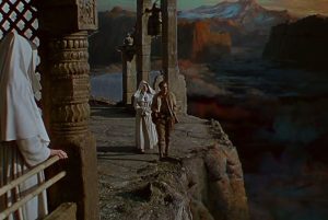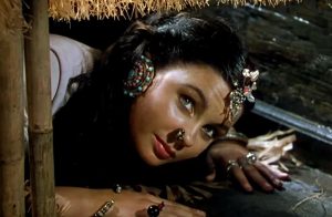 As if representing the buried desires of the nuns, Kanchi (Jean Simmons) then appears on the scene as a dancing, snakelike temptress; the very manifestation of what these women could be if they at last gave up this religious silliness. She’s an outsider of sorts, but playful and free, though she usually resorts to the expected moves of an Indian woman. As played by Ms. Simmons, she’s yet another example of early Hollywood’s attempts to dress up a white actress as an “exotic.” The bronzer and nose ring convince no one, but her mute flirtations are a camp delight (especially when she appears to be moving in for a blowjob with an unusually effete Young General, played by Sabu).