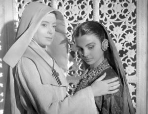 Sister Clodagh (Deborah Kerr) leads her fellow nuns as lambs to slaughter, and it is her marble exterior that masks the deepest regret. As expressed in flashbacks (curiously cut in many U.S. prints, not that the Catholic Legion of Decency had anything to do with it), Clodagh had a life before the nunnery; one of both joy and fulfillment, she was led to the convent only after her lover left for America and refused to get married. In these scenes, she is spirited and sexy, and as such, contradicts the long-held notion that God’s faithful worker bees are “called” from an early age.