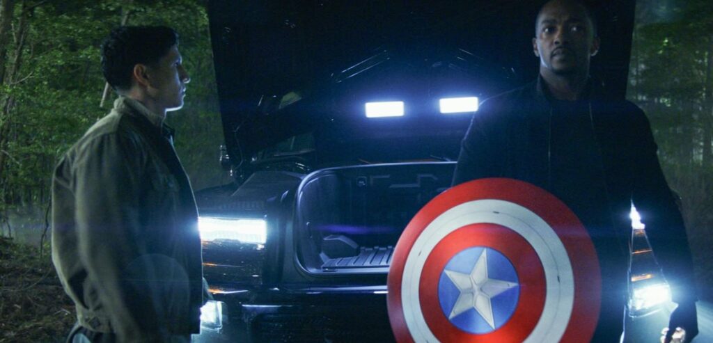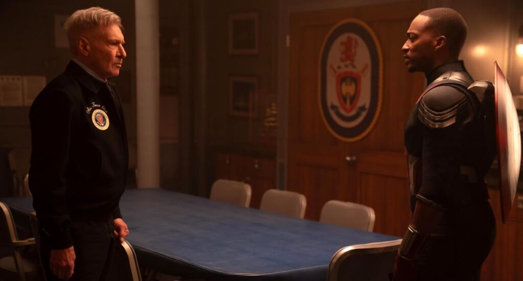 Brave New World opens with Sam Wilson (Anthony Mackie), a.k.a. Captain America, a.k.a. Falcon intercepting an illegal sale of some stolen adamantium. Along for the ride is his sidekick, Joaquin Torres (Danny Ramirez), a.k.a. Falcon, a.k.a. Robin. Ok, so Wilson doesn’t go by Falcon anymore, despite still featuring his advanced falcon wings and jetpack. And Torres doesn’t go by Robin because this isn’t a Batman movie.