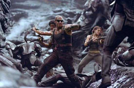 - Speaking of selling out for money, Rotten Shit-Fest had a “PG-13” rating. The original, of course, was rated “R.” Mostly because it was about a fucking serial killer trapped on a planet of man-eating monsters. Now, obviously, the whole affair was dumbed down so that the kiddies would come and give yet more of their parents’ hard-earned money to the studios. But the result, cinematically, are some of the least compelling fight scenes I have ever witnessed. In both films, Riddick’s weapon of choice is the blade.” Only in this one he stabs about 250 people and there is not a single drop of blood! Stupider still, is the fact that without actual bloodshed, it appears as if Riddick and friends are just dancing with each other. Lame. The “PG-13ing” also means that even though there is more cleavage on screen than a Girls Gone Wild tape (Rotten Shit-Fest’s lone redeeming quality), no sex or sexual anything of any kind is allowed to happen. This fact only adds to the dullness.
