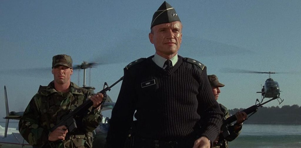 Some army bloke arrives who’s not Colonel Samuel Trautman. No matter. He warns Death that things are looking screwy and leaves behind two of his best men as security. This is stupid. Why does he think Death needs protecting? After all, this is a man who’s so tough he can not only hear an approaching chopper before it’s even fired up its blades but smell a hidden would-be assassin at a distance of two hundred yards. And apart from that, he’s confident enough to make jokes about Boy George’s perceived lack of masculinity. Sure enough, the two ‘protectors’ prove to have ridiculously small cojones and immediately get killed by the ex-dictator’s non-baking contingent. The daughter is whisked away and Death (after leaping from a departing aircraft) has eleven hours to save her life.