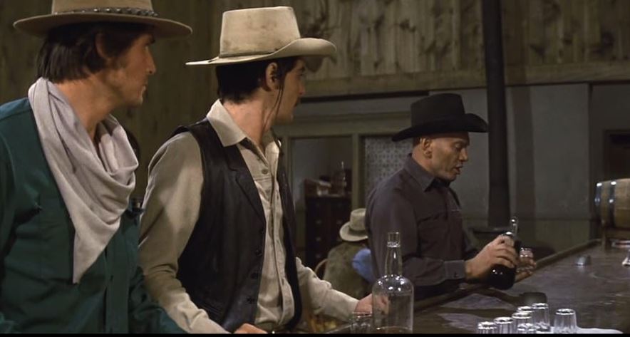 Not that our novice cowboys have the slightest notion of this fly in the ointment. Shortly after arrival, Peter gets to test his mettle when Yul Brynner deliberately bumps into him in a saloon, spilling his drink. “Get this boy a bib,” the surly newcomer tells the barman. “He needs his mama.” A gunfight then plays out in which Peter, of course, triumphs. Peter can barely believe what he’s done, his brain obviously zinging with endorphins. Before long he’s having a great time at a bordello and gleefully kicking in doors to shoot the baddies…